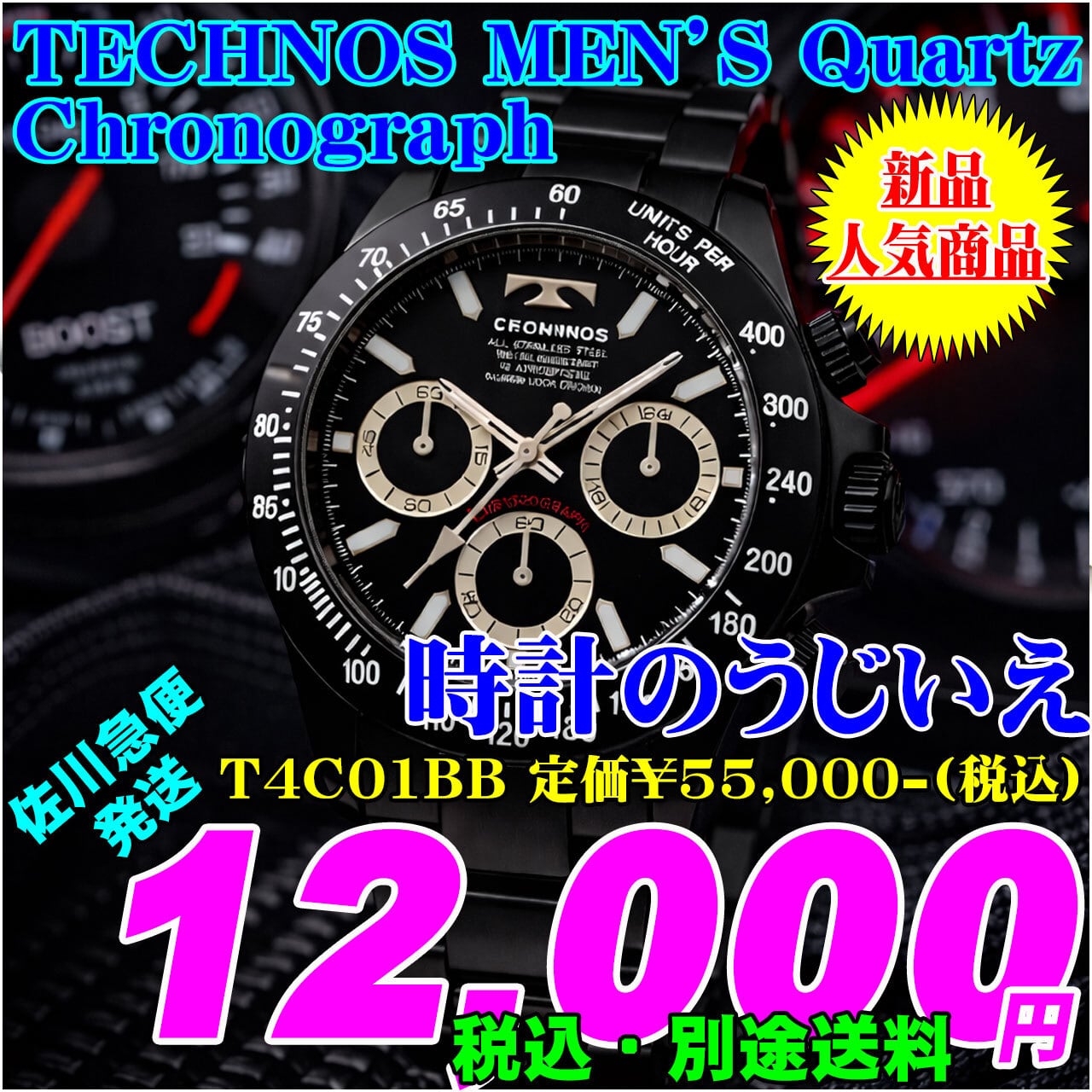 腕時計 黒文字盤 ブラック TECHNOS テクノス 男 クォーツ 10気圧防水 Chronograph クロノ T4C01BB 定価¥55,000-(税込) 新品